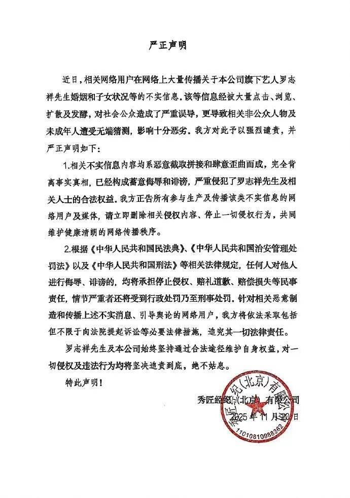 此前,罗志祥工作室曾发声明回应网上流传的婚姻和子女状况消息。