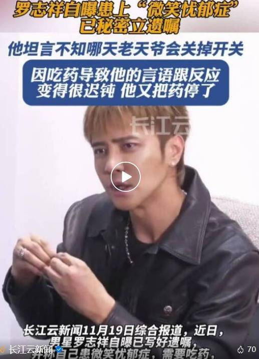 11�日,据钱江晚报消息,近日,男星罗志祥自曝已写好遗嘱,并称自己患微笑忧郁症,需要吃药,吃药导致他的很多言语跟反应变得很迟钝,影响到他工作,他又把药停了。